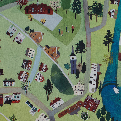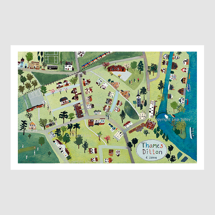 Thames Ditton II shows an aerial view of the village. The painting was quite an undertaking, as I hadn’t realised that by including over 50 houses and buildings, I need to sketch, mix individual colours and paint them all. I am lucky that I know the village really well, it was easy and quick to design the composition.